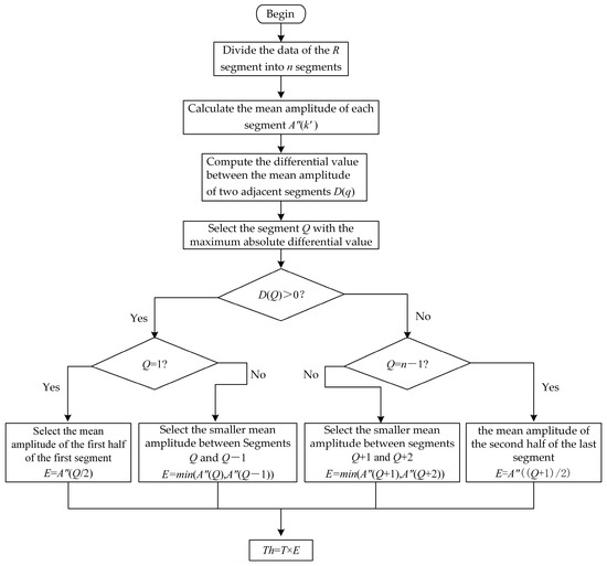 - Treat the mean of the segments of length and the mean of the segments of length as the interference set. Compare all data in the interference set with the initial threshold. Data smaller than the initial threshold are classified into the noise set , while the remaining data are classified into the interference set .