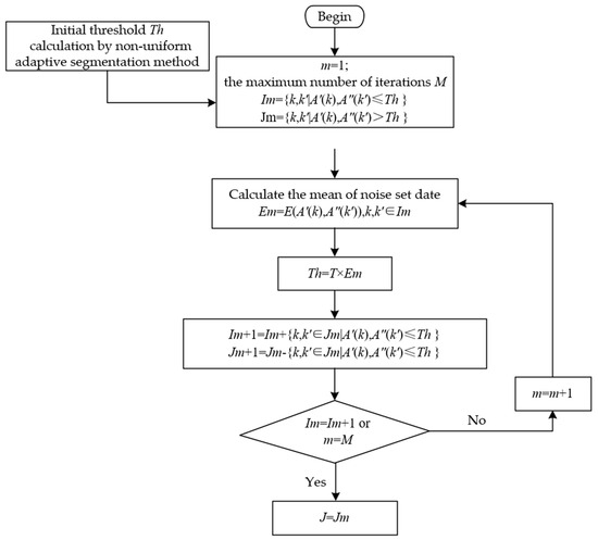 - Use the noise set to calculate the next threshold. Data in the interference set that are smaller than the new threshold are moved to the noise set, updating it to , while the remaining data stay in the interference set, updating it to .