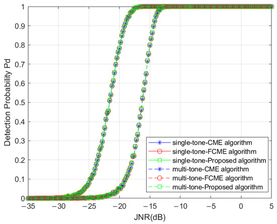 As illustrated in Figure 5, the detection performance of the CME, FCME, and the proposed algorithm is nearly identical. For single-tone interference, when JNR > −18 dB, the detection probability can approximately reach 1. For multi-tone interference, when JNR > −13 dB, the detection probability can approximately reach 1. Under the same JNR conditions, the detection probability of single-tone interference is higher than that of multi-tone interference. For the same detection probability, single-tone interference outperforms multi-tone interference by approximately 5 dB. The increase in the number of interference frequencies causes the interference signal energy to become more dispersed, thus requiring a higher JNR to achieve the same detection probability.