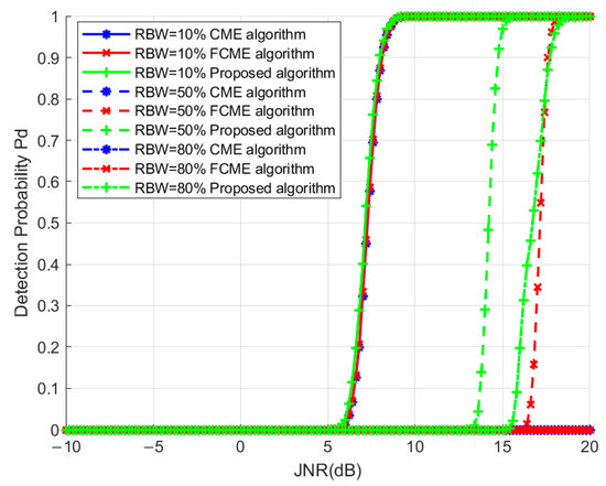 Figure 6 illustrates the detection probability curves for different bandwidth interferences using the three algorithms. When RBW = 10%, the detection performance of the CME, FCME, and the proposed algorithm is nearly identical. When RBW = 50%, the proposed algorithm performs about 3 dB better than the FCME algorithm, while the CME algorithm completely fails. This is because the CME algorithm assumes that all samples are free from interference when calculating the initial threshold, and as the interference bandwidth increases, the initial threshold becomes too high, making it unable to detect the interference signal. When RBW = 80%, the proposed algorithm still maintains good detection performance, whereas the CME and FCME algorithms nearly fail completely. Additionally, it can be observed that the detection performance of the algorithms decreases as the relative bandwidth increases.