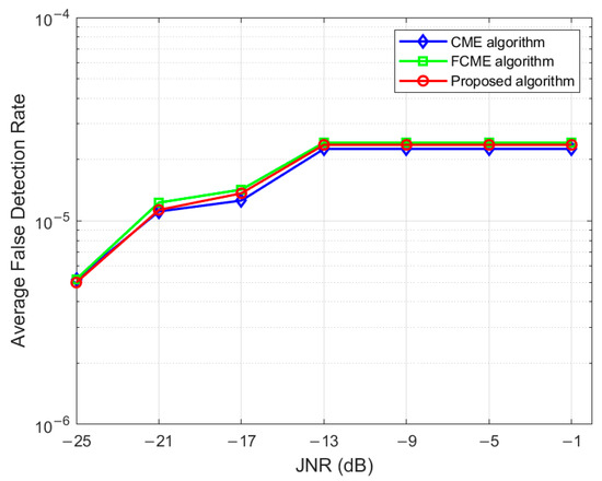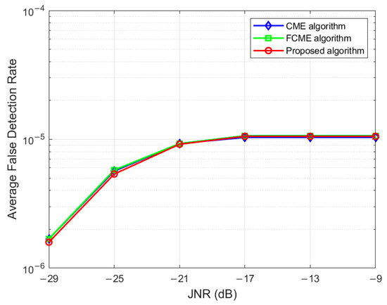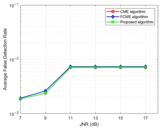 As illustrated in Figure 9, the average false detection rates of the three algorithms also increase with the JNR at first, and then gradually level off, with the values being nearly identical across all the three methods (with similar trends as illustrated in Section 4.3.1).