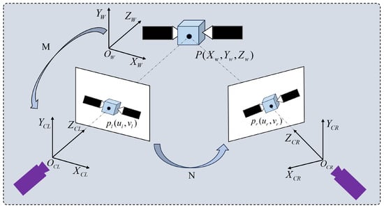 The non-cooperative spacecraft pose estimation system based on stereo cameras has always been an important research field. Figure 1 represents a schematic diagram of the binocular pose measurement model, where the left camera coordinate system is denoted as  O C L X C L Y C L Z C L . The coordinate system of the right camera is denoted as  O C R X C R Y C R Z C R , and the origin of the left camera coordinate system is located at the optical center of the left camera, denoted as  O C L . The  X C L  axis is parallel to the rows of the image, the  Y C L  axis is parallel to the columns, and the  Z C L  axis is the optical axis of the left camera. Similarly, in the right coordinate system, the  O C R  origin is located at the optical center of the right camera, the  X C R  axis and the  Y C R  axis are parallel to the rows and columns of the right image, and the  Z C R  axis is the optical axis of the right camera. The world coordinate system coincides with the left camera coordinate system. For any arbitrary point P on the surface of the satellite, its world coordinate system coordinates are  ( X w , Y w , Z w ) , the projection point in the left camera is  P l  with pixel coordinates  ( u l , v l ) , and the projection point in the right camera is  P r  with pixel coordinates  ( u r , v r ) . The world coordinate system can be transformed to the pixel coordinate system using the spatial transformation matrix M, and the transformation relationship is given by Equation (1).