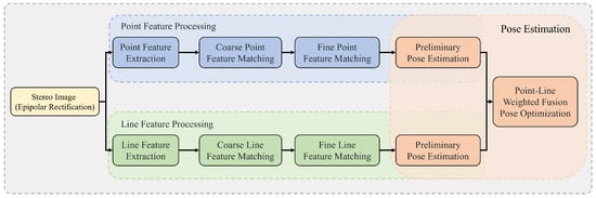 Figure 2. Flowchart of our point-line feature fusion algorithm. Stereo images undergo parallel point and line feature extraction and matching, followed by weighted fusion using a designed algorithm to obtain the optimal final pose.