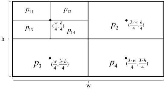 Repeat the above three steps to perform feature point extraction. Assuming the image has a pixel size of  w × h , regions are divided equally around pixel points  ( w 4 , h 4 ) , ( 3 · w 4 , h 4 ) ( w 4 , 3 · h 4 ) , and  ( 3 · w 4 , 3 · h 4 ) , in the upper left, bottom left, upper right, and bottom right directions, resulting in the following 16 regions:  p 11 , p 12 , p 13 p 44 . The specific arrangement is shown in Figure 3: