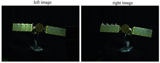 We have obtained the desired set of feature points through the aforementioned algorithm steps. Therefore, we will now proceed with the feature matching algorithm. However, due to the structural similarities in the space model we are dealing with, there still exist sets of feature points with similar attributes on the same epipolar line. As shown in Figure 4, the surrounding pixel information of points a, b, c, and d is extremely similar, making it difficult to distinguish them using the current algorithm. Correspondingly, in the right image, each of the points  a 1 b 1 c 1 , and  d 1  has similar pixel features. Hence, even under the constraint of the epipolar line, there will still be a possibility of point a being matched to any one of the points  a 1 b 1 c 1 , or  d 1 . The presence of these mis-matched points participating in the pose calculation process can severely impact the accuracy of the measurement algorithm. As the linear features of the spacecraft’s solar panels in space targets are abundant, we have developed the following matching algorithm to filter out non-matching feature point pairs. The specific algorithm steps are as follows: