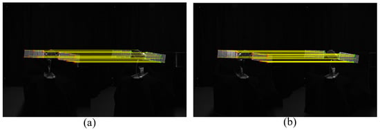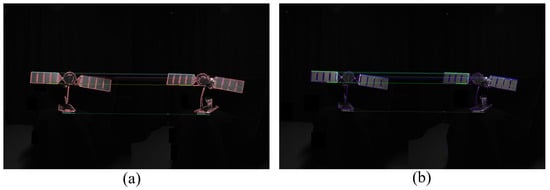 Figure 5. We collected a dataset of 30 stereo image pairs in a darkroom with 1.2 lux illumination, simulating the working environment of binocular cameras under real-space conditions. Using the Shenzhou-11 spacecraft docking model as our subject, we validated the performance of our algorithm on the constructed image dataset. The figure demonstrates the practical extraction and matching results of our algorithm applied to the docking model images.