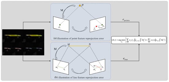 Figure 7. Since both point and line feature extraction methods may introduce a certain degree of error, leading to suboptimal pose measurement accuracy, we not only enhanced the point-line feature extraction and matching algorithms but also developed an error model in the final pose-solving stage to reduce measurement errors. Specifically, we first developed reprojection error models for point and line features respectively to perform preliminary pose optimization. Subsequently, we fused the point-line features using an illumination-based adaptive weighting method to further improve the final pose estimation accuracy. A schematic diagram of this algorithm is shown in the figure, where the left panel demonstrates the effectiveness of point and line feature extraction and matching.