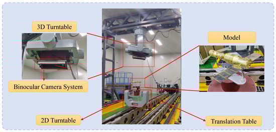 To validate the effectiveness of our proposed method, we conducted comparative simulation experiments under normal lighting conditions and low-light environments. We used a stereo camera with a resolution of 2048 × 2048 pixels and a baseline length of 38 cm. The target was stationary on a turntable, and the stereo camera moved at a speed of 1 cm/s from a distance of 141 cm, capturing one frame per second. Our algorithm was applied to process each captured frame. The specific experimental setup is shown in Figure 8.
