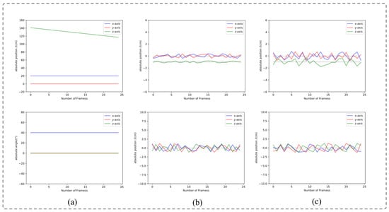 To represent the relative poses between non-cooperative targets, we calculated the differences between consecutive frames. As shown in Figure 9b, in a well-lit environment, our algorithm produced relatively stable relative poses for the non-cooperative targets. Specifically, the errors in the X and Y axes were mostly within 0.4 cm, and the error in the Z axis was within 0.2 cm. The attitude angle error was within 1.3 degrees. In summary, our algorithm exhibited stronger stability and higher accuracy in output results under good lighting conditions.