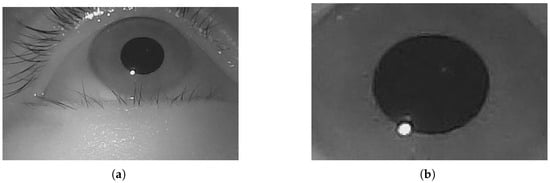 Compared to the first Purkinje image, the fourth Purkinje image is smaller and darker, making it more difficult to detect using contour-based methods. We employed a template matching algorithm to detect the fourth Purkinje image [21]. For each subject, the fourth Purkinje image was extracted from the eye image and used as a template. After applying the template-matching algorithm to the PROI, we located the coordinates of the maximum value in the resulting matrix. The calibrated center coordinates of the ellipse were then considered as the center coordinates of the fourth Purkinje image. Figure 6 shows examples of the fourth Purkinje image detection and the template image.