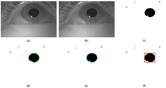 Pupil detection process: (a) ROI, (b) blurred ROI, (c) binarized ROI, (d) detected contour, (e) detected ellipse, (f) detected bounding box.