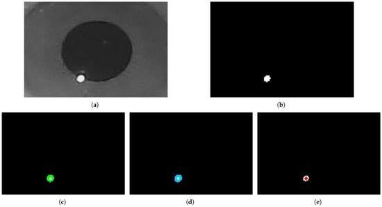 First Purkinje image detection process: (a) PROI, (b) binarized PROI, (c) detected contour, (d) detected ellipse, (e) detected center of the first Purkinje image.