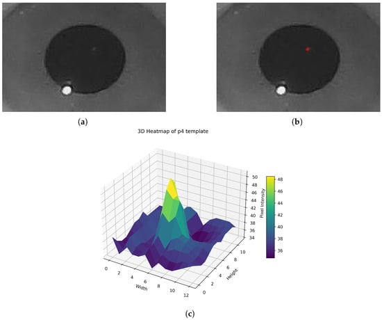 Fourth Purkinje image detection process: (a) PROI, (b) detected center of the fourth Purkinje image, (c) 3D heatmap of the fourth Purkinje image template.