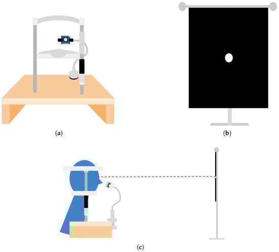 Experimental setup: (a) head-and-chin rest and camera setup, (b) target used in the experiment, and (c) example showing experimental equipment in use.