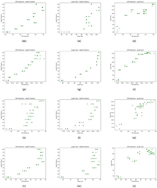 We plotted a 2D scatter plot for each of the depth fixation, DPI distance, and pupil size. The following scatter plots illustrate the relationships between DPI distance and depth fixation, pupil size and depth fixation, and DPI distance and pupil size for each subject (Figure 8). Depth fixation is measured in cm, while DPI distance and pupil size are measured in px.