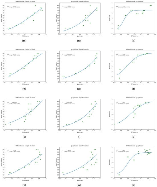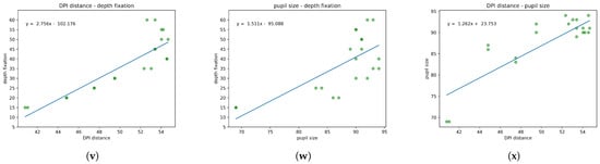 Graphs for Subjects 1, 2, 4, 5, 7, 8, 10, and 11 are shown in the order listed above. (a,d,g,j,m,p,s,v): DPI distance vs. depth fixation, (b,e,h,k,n,q,t,w): pupil size vs. depth fixation, (c,f,i,l,o,r,u,x): DPI distance vs. pupil size, along with their corresponding graphs and equations (The darker areas of the points indicate regions where data points with the same value overlap, resulting in visually stronger colors).