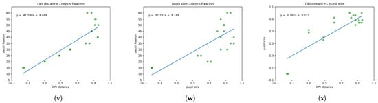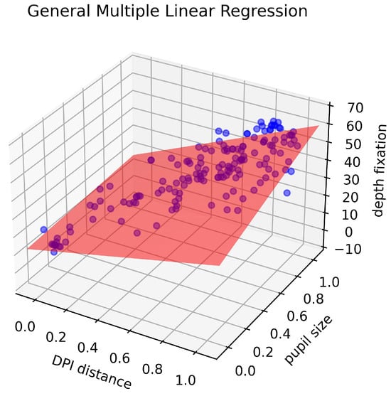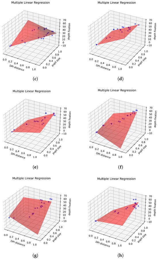 Thus far, we have analyzed the one-to-one relationships between the variables. In this section, we investigate how using both DPI distance and pupil size affects depth estimation. To investigate this, a multiple linear regression was conducted with DPI distance and pupil size as independent variables and depth fixation as the dependent variable. In order to focus on the relationship analysis, the regression was performed using the model y = a + b + c + d, excluding the quadratic term. Here, y, , and represent the depth fixation, DPI distance, and pupil size, respectively. The graphs of the multiple linear regression results are shown below (Figure 12).