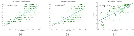 The scatter plots show that the DPI distance and pupil size tended to increase as the depth fixation increased. Additionally, the scatter plot of DPI distance vs. pupil size indicates that an increase in one variable tends to be associated with an increase in the other. To statistically quantify their relationships, a correlation analysis was conducted between the variables.