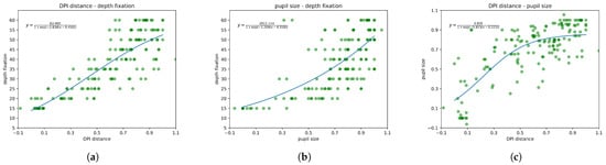 To evaluate the performance of the regression model, we used the R-squared (R2) and root mean squared error (RMSE) indicators. The R2 value indicates how well the model explains the variance, and is used to assess its fit. Values close to 1 indicate a good fit, while those close to 0 indicate a poor fit. The RMSE is the square root of the mean squared difference between the actual values and the values predicted by the regression model. It represents the error in the original units of the data, and is used to assess the predictive performance of the model. The table below summarizes the R2 and RMSE results (Table 2). RMSE is measured in cm for DPI distance vs. depth fixation, cm for pupil size vs. depth fixation, and px for DPI distance vs. pupil size.