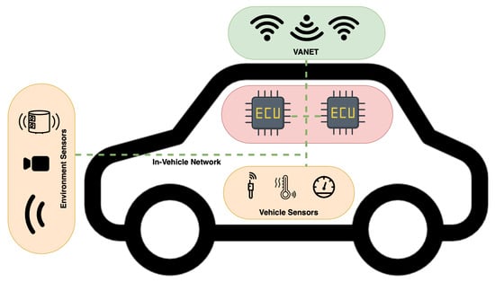 Smart vehicle hardware can be roughly divided into sensors, which are responsible for sensing the environment and in-vehicle state; Electronic Control Units (ECUs), which are responsible for processing the data; and vehicle networks, which are responsible for connecting the sensors, ECUs, and vehicle controllers but also for data exchange with other entities (i.e., other vehicles and remote data sources). A schematic reference of such a division is reported in Figure 2.