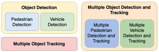 The road context poses specific challenges that require dedicated investigations. In particular, pedestrians and other vehicles have different sizes and different usual dynamics, which, in some cases, introduces the need for even more specific algorithm tuning. Additionally, depending on the specific object of interest and driving conditions, each of the previously discussed sensors shows specific advantages and disadvantages, leading to the involvement of sensor fusion strategies [21]. An additional level of complexity in defining a well-structured literature review is given by the strong interdependence of the involved tasks, which has led many works to treat detection and tracking as a single objective. Figure 3 attempts to give a schematic representation of the main computational tasks involved in this type of research. Each task will be analysed in the following.