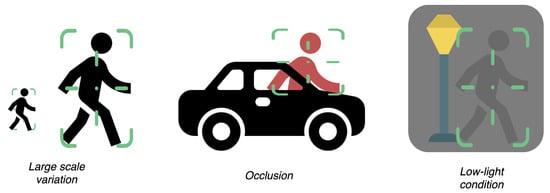 An intuitive representation of the main challenges involving pedestrian detection. From left to right: large-scale variation, occlusion, and low-light conditions.