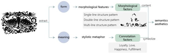 The extraction of semantic factors aims to identify the hidden meanings, symbols, and cultural connotations embedded within the patterns, serving as implicit features to interpret their style and symbolic significance [16,27]. In the context of Dong culture, certain symbols carry specific meanings. Through discussions with Qin, we explored her interpretations and understanding of pattern semantics, as well as how she infused specific meanings and emotions into her designs during the creative process.