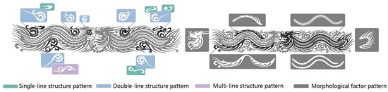 The shapes and lines of paper-cut patterns are the core of the design. The arrangement, size, and proportional relationships of these elements directly affect the aesthetics, balance, and style of the patterns [26]. In Qin Naishiqing’s 130 paper-cut works, we focused on analyzing the shape elements and lines, extracting and summarizing the most recognizable features. These features are primarily reflected in the pattern’s shape factors, which can be considered the reusable “language” of the pattern [11]. The use of reusable language helps create consistent styles. These lines and shape elements can be combined and applied in various ways across different contexts, resulting in diverse works that maintain consistent stylistic characteristics.