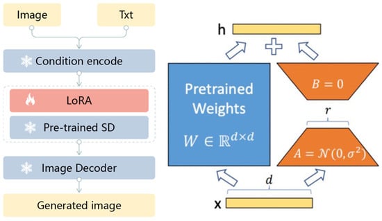 In our experiments, we fine-tuned an open-source Stable Diffusion model using LoRA. The structure of the LoRA model [37,38] is illustrated in Figure 3.