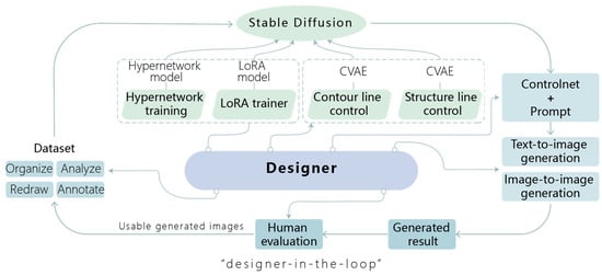The application of generative AI technology in traditional pattern design has made significant progress in recent years, offering new possibilities for the digital preservation and innovation of traditional art. Among the mainstream technologies, Generative Adversarial Networks (GANs) have been widely used in the generation research of traditional patterns, such as embroidery, ceramics, and paper cutting. For example, Yongho Kim et al. [18] used CycleGAN to perform style transfer on real images, generating images that resemble the styles used in historical books and successfully integrating tradition with reality through style transfer. Yan, Han, et al. [19] applied style transfer techniques to integrate traditional ceramic patterns into modern decorative designs, demonstrating the potential of generative AI in cross-era design. Additionally, Variational Autoencoders (VAEs) and Diffusion Models have also demonstrated unique advantages in pattern generation [20,21]. VAEs excel in feature extraction and data compression [22], while Diffusion Models are highly effective in generating high-quality images [23]. However, existing research is mainly focused on technological implementation, with limited attention given to collaborative cooperation between designers and intelligent generative models. Furthermore, challenges remain in understanding cultural semantics and expressing fine details. For instance, Jiangfeng Liu et al. [24] noted that generative AI struggles to accurately capture the cultural connotations behind traditional patterns, leading to generation outcomes that lack cultural accuracy. To address these limitations, this paper proposes an AI-controllable collaborative method between designers and intelligent generative models, specifically targeting small sample-sized Dong paper-cut patterns. This approach aims to explore methods for improving cultural semantic understanding and detail expression in generative AI, offering new insights for the digital preservation and innovation of traditional pattern design.