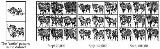 During the label assignment process, multiple aspects must be carefully considered, including stylistic characteristics, semantic expression, and visual presentation. A precise and descriptive approach, aligned with the artistic traits of paper-cutting, is essential to ensure meaningful classification and optimal model training [40]. Experimental results indicate that avoiding direct labeling of content attributes and instead adopting stylistic descriptors significantly enhances the diversity of generated patterns. For instance, explicitly labeling an image with “cattle” or another specific animal attribute often causes the model to rigidly adhere to the predefined shape characteristics thereby restricting the creative variation of the generated paper-cut patterns. Conversely, employing style-based descriptors—such as “symmetrical”, “hollowed-out”, and “streamlined”—allows the model to learn the abstract visual features of paper-cut art more freely, resulting in greater diversity and stronger stylization in the generated patterns.