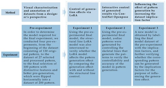 To investigate the controllable generation of Qin’s Dong paper-cutting patterns, the study followed a structured experimental framework encompassing dataset construction, model training, and controlled generation strategies. The full experimental workflow is illustrated in Figure 6.