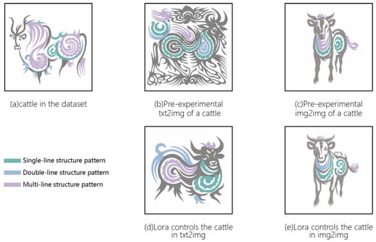 A comparative analysis of the pre-experiment results and representative samples from the original dataset revealed deficiencies in the richness of generated pattern details. Taking the “cattle”-themed paper-cut pattern as an example, the original dataset exhibited a high degree of diversity and complexity in the use of single-structure, double-structure, and multi-structure lines. A systematic analysis of the dataset’s visual characteristics revealed that pattern diversity and stylization were primarily determined by structural factors. By extracting and summarizing shape elements and line structures from 25 of the most representative paper-cut patterns by Qin Naishiqing, the research team identified 43 single-structure lines, 20 double-structure lines, and 20 multi-structure lines. To further examine the impact of structure lines on the generation process, three independent LoRA models were trained, each corresponding to the single-line, double-line, and multi-line structures. These LoRA sub-models were subsequently applied to the base model, enabling controlled generation and systematic exploration of how different structural lines affect the final output.