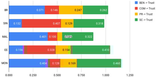 Next, we assessed the discriminant validity (DV) for the refined model using the Fornell–Larcker criterion. This criterion evaluates the correlations between each item and the constructs in the model. In all samples, each construct’s highest correlation was with its own construct, demonstrating that there are no issues with DV. The table with the DV results is available in the Appendix B (Table A2). The highest values per construct per country are highlighted to facilitate interpretation. Finally, we looked at R², representing the explained variance of the endogenous construct (Trust) by the exogenous constructs (COM, BEN, PR, and SA). The values were as follows: Brazil = 0.625, Singapore = 0.589, Malaysia = 0.510, Estonia = 0.682, and Mongolia = 0.736; all were considered adequate in our domain of study.