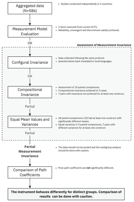 Our study follows the steps recommended for the MICOM procedure in the literature [,,] to explore individuals’ national culture’s influence on the HCTS. While the MICOM is at the core of our article, we first evaluated the measurement model to ensure its validity in the countries included and later analyzed the path coefficients to further explore the effect of national culture on the model’s behavior. All procedures are detailed in this section.