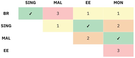 This result has more serious implications for the HCTS, as the lack of compositional variance indicates that the constructs are formed differently across groups, and thus, their comparison can be misleading [], as the differences may be a result of differences in the measurement model. In practical terms, this implies that comparisons between countries can only be confidently conducted between the pairs in which compositional invariance was achieved. Figure 4 summarizes the paired comparisons. The pairs with check marks (✓) achieved compositional invariance. The others have partial compositional invariance, and the numbers in the cells reflect the amount of constructs that do not satisfy the condition. For the pairs with partial compositional invariance, only the constructs that satisfy the condition should be compared, as per Table 4.