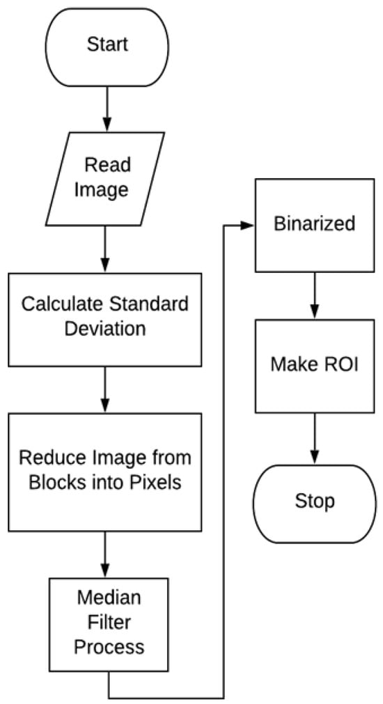 Before the cropping procedure can be executed, ROI extraction must be performed. This step is essential, since the FVC2002 dataset consists of full fingerprint images. Partial fingerprints are subsequently obtained by extracting the relevant region from the full image. A flowchart illustrating the ROI extraction process is presented in Figure 2.