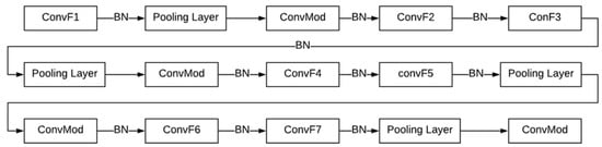 Based on Table 1, the CNN architecture, which integrates both feature extraction and model processing, is depicted in Figure 4 as an illustration of CNN reconstruction. The CNN architecture is designed to process partial fingerprint images of different resolutions (184 × 184, 160 × 160, and 152 × 152 pixels). Each image size produces unique parameters while following the same CNN structure. The training process starts with an image being input into the ConvF1 layer, where batch normalization is applied before passing it through the pooling layer. The image is then processed through ConvMod, which includes a batch normalization step before re-entering the subsequent ConvF layer. After the initial feature convolution operation, the following convolution steps involve two sequential convolutional layers, each configured similarly to ConvF1, incorporating batch normalization and ReLU activation before transitioning to the pooling layer. This iterative ConvMod process is repeated after each pooling layer operation.