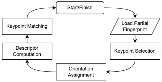 To mitigate the challenges associated with both minutiae-based and deep learning methods, researchers have explored hybrid approaches that integrate traditional feature descriptors with machine learning models. One notable strategy involves incorporating Scale-Invariant Feature Transform (SIFT) descriptors to enhance local feature matching [,]. SIFT-based fingerprint recognition has demonstrated robustness against variations in scale, rotation, and illumination []. Moreover, hybrid models that combine CNN-extracted features with handcrafted descriptors have been proposed to improve the matching accuracy [,]. These methods leverage the hierarchical representation capabilities of deep learning while retaining the precision of handcrafted feature extraction.