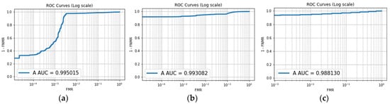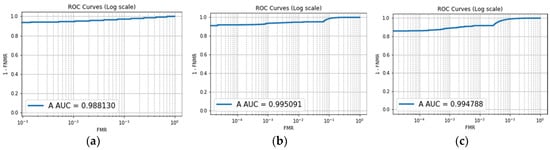 Similarly, the ROC curve illustrated in Figure 7 enables the evaluation of the impact of an appropriate number of epochs on an image size of 184 × 184 pixels. The resulting ROC curves exhibit an almost linear trend, with AUC values exceeding 90%. This observation suggests a high likelihood that the classifier successfully differentiates between genuine and impostor class values. This performance is attributed to the classifier’s ability to effectively detect False Acceptance Rates (FARs) and False Rejection Rates (FRRs).
