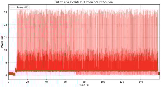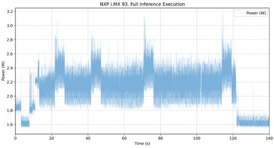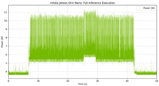 The Figure 7 represents the complete inference process, showing a transition from idle to active execution and back to idle. Power consumption starts at around 3.77 W in the idle phase and increases to an average of 6.27 W during inference, with frequent spikes reaching up to 11.44 W.