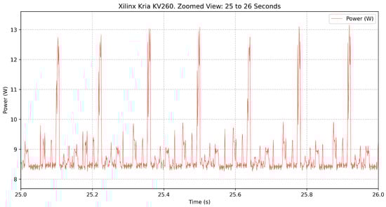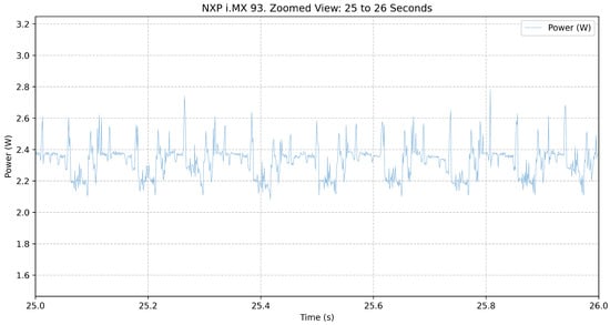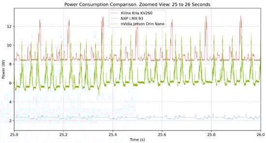 Figure 11 presents a zoomed-in comparison over a 1-s interval, revealing power fluctuations at a finer scale. The KV260 maintains a high baseline power level with moderate fluctuations, while the Jetson Orin Nano exhibits frequent, high-amplitude power spikes. This suggests a dynamic power scaling strategy where power consumption is rapidly adjusted based on computational demand. NXP i.MX93, in contrast, remains remarkably stable, exhibiting small variations in power draw.
