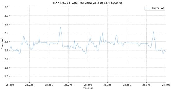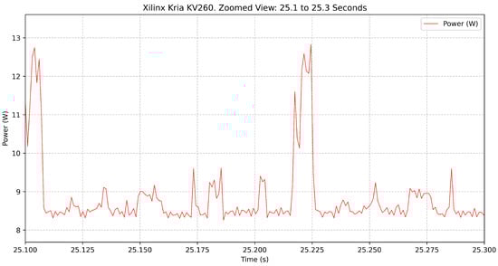 A further high-resolution view of a 200 ms interval is provided in Figure 12. The Jetson Orin Nano continues to exhibit frequent sharp peaks, with power draw exceeding 10 W at regular intervals. The Kria KV260 remains relatively stable at a high-power level, with occasional fluctuations, while the NXP i.MX93 maintains a consistently low power profile, reinforcing its suitability for energy-constrained applications.
