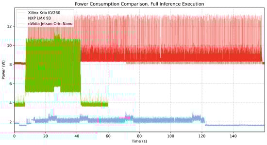 Figure 10 provides a global view of the power consumption for each platform throughout the entire inference execution. The Xilinx Kria KV260 has the highest power consumption, averaging 8.75 W in active mode, with peaks exceeding 13 W. The NVIDIA Jetson Orin Nano exhibits a lower average power draw of 6.27 W, yet frequent fluctuations and peaks up to 11.44 W suggest aggressive power scaling. In contrast, the NXP i.MX93 maintains the lowest energy profile, averaging 2.14 W with minimal variations.