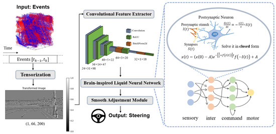 The architecture of LiS-Net introduces a novel integration of event camera data with brain-inspired neural networks to predict steering angles in an end-to-end manner. This framework incorporates four key components: tensorization, a convolutional feature extractor, a brain-inspired liquid neural network, and a smooth adjustment module. The process begins with the preprocessing of raw event data, which are converted into a structured tensor format, suitable for downstream processing. The preprocessed tensors are then passed into a convolutional feature extractor that learns spatial representations from the input data. These features are subsequently fed into the brain-inspired liquid neural network, which is designed to capture the temporal dependencies and dynamic patterns inherent in event-based data. The final step involves a smooth adjustment module that refines the predictions, ensuring both accuracy and temporal smoothness in the steering angle output. To thoroughly assess the robustness and generalizability of LiS-Net, we conducted experiments using the Carla simulation dataset EventScape for training and testing, and we further validated the trained model on a self-collected dataset that includes multiple sensors, such as event cameras, frame-based RGB cameras, GPS, and Controller Area Network (CAN) data. The deployment of the model on real-world data not only extends its validation beyond simulated environments but also provides a comprehensive evaluation of its performance in diverse conditions.