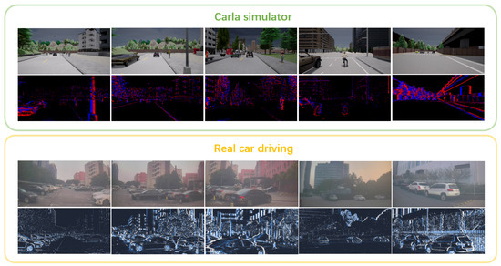 As shown in Figure 4, the real-world dataset in this study consists of data collected from a forward-facing event camera mounted on the roof rack of a vehicle. The vehicle was driven manually by a professional driver, ensuring precise control during data collection. During the data acquisition process, both the environmental data captured by the event camera and the corresponding control signals (e.g., steering angles and vehicle speed) were recorded concurrently. The control signals, obtained from the vehicle’s control system, serve as the ground truth for evaluating the accuracy of the model’s predictions. Similar to the EventScape dataset, the real-world data used for testing was also recorded under clear weather conditions, ensuring consistency with the simulated training data. This approach allows for a thorough assessment of the model’s robustness and its ability to generalize from simulated environments to real-world scenarios.