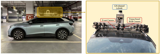 This figure shows the data collection platform used in this study. As depicted in the diagram, the vehicle is equipped with multiple sensors mounted on the roof rack, including a 128-channel LiDAR, event cameras, and frame-based RGB cameras.