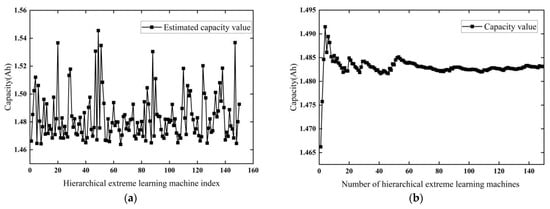 To determine the optimal number of HELMs for the I-HELM model, various numbers of HELMs were tested for capacity estimation of battery D26. As shown in Figure 5b, the estimation results gradually stabilized as the number of HELMs increased. When 80 HELMs were used, the capacity estimation no longer exhibited significant fluctuations, indicating that an I-HELM model with 80 or more HELMs provides stable capacity estimations. Based on these results, the integration degree of the I-HELM model was set to 80 to ensure stable capacity estimations.