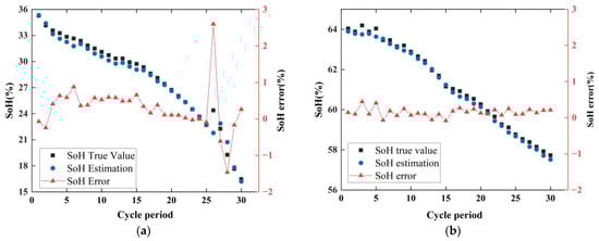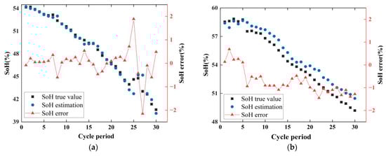 To evaluate the model’s estimation performance under constant-current conditions, we applied the I-HELM algorithm to Samsung retired batteries D22 and D26. The detailed SOH prediction results for these two cells are shown in Figure 6, where the estimated values are compared with the experimental data to assess accuracy.