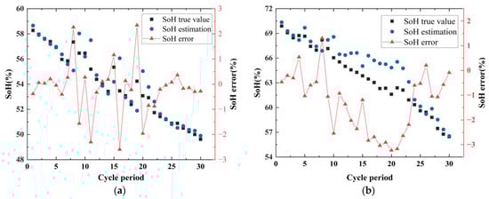 As seen in Figure 8a, the estimated SOH closely tracks the true SOH, with the estimation error remaining within 3%, although it increases when the SOH of the Pack 1 battery group fluctuates. Figure 8b demonstrates that the estimated SOH is highly consistent with the true values, with minimal error. These results confirm that the I-HELM algorithm can accurately estimate the SOH of the Samsung retired battery packs under both constant-current Condition 1 and dynamic-current Condition 2.